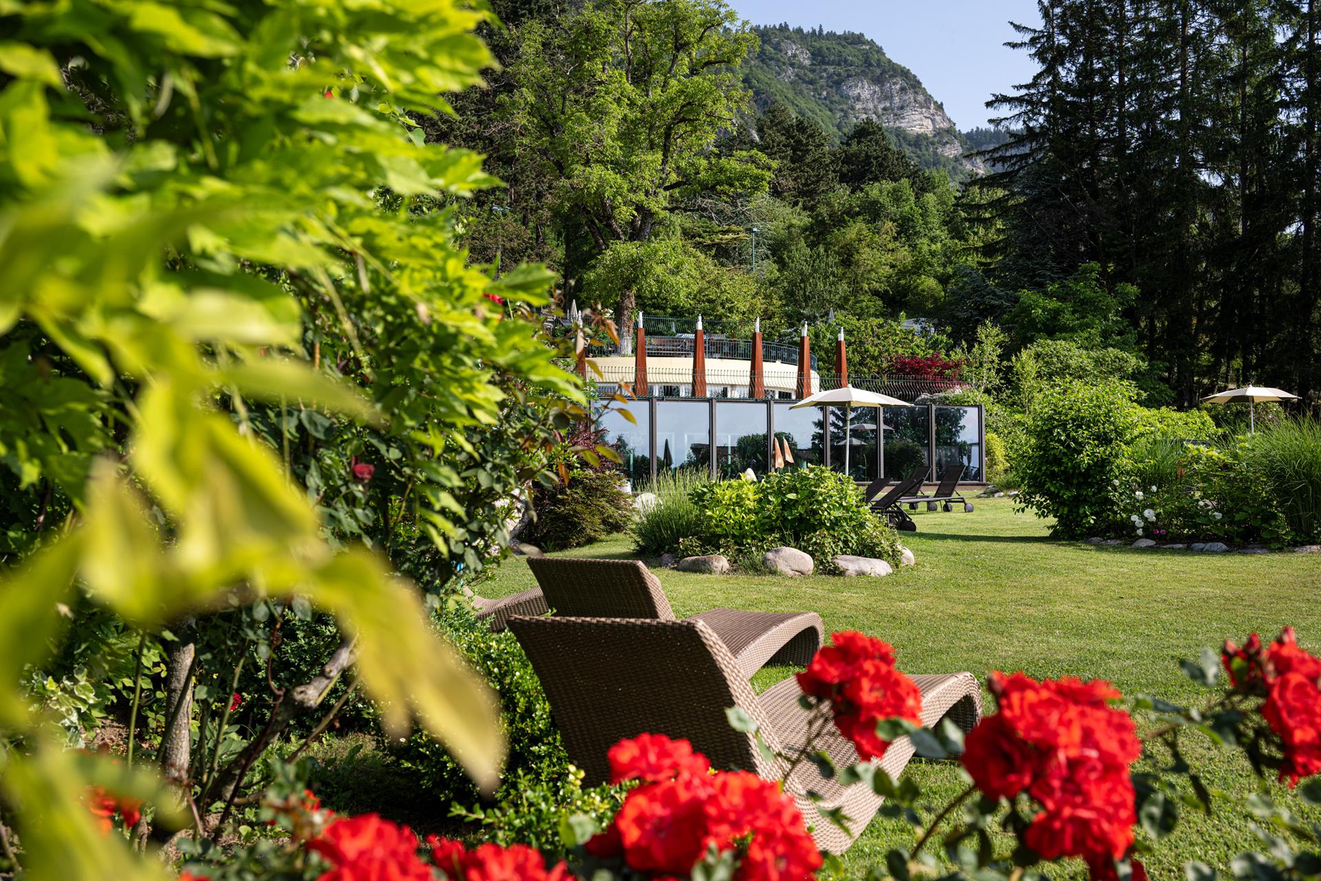 Die Gärten entwickeln sich auf mehreren Ebenen, mit panoramischen Terrassen, schattigen Bereichen und offenen Flächen, die zum Verweilen, Bewegen und Durchatmen einladen. Der Blick öffnet sich zu den Bergen, während die Wege direkt in den Wald führen – dank des direkten Zugangs zu den Wanderwegen, die im Park beginnen.