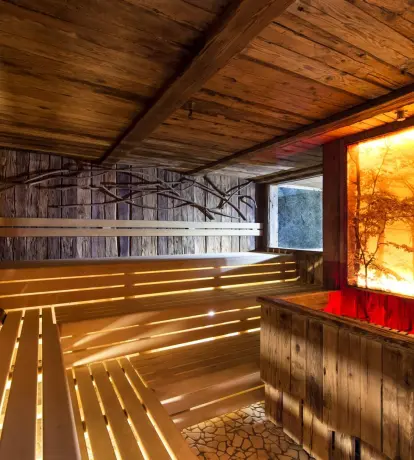 - große Tiroler Sauna aus antikem Lärchenholz mit alpinem Kräuteressenzen- Aufgüssen