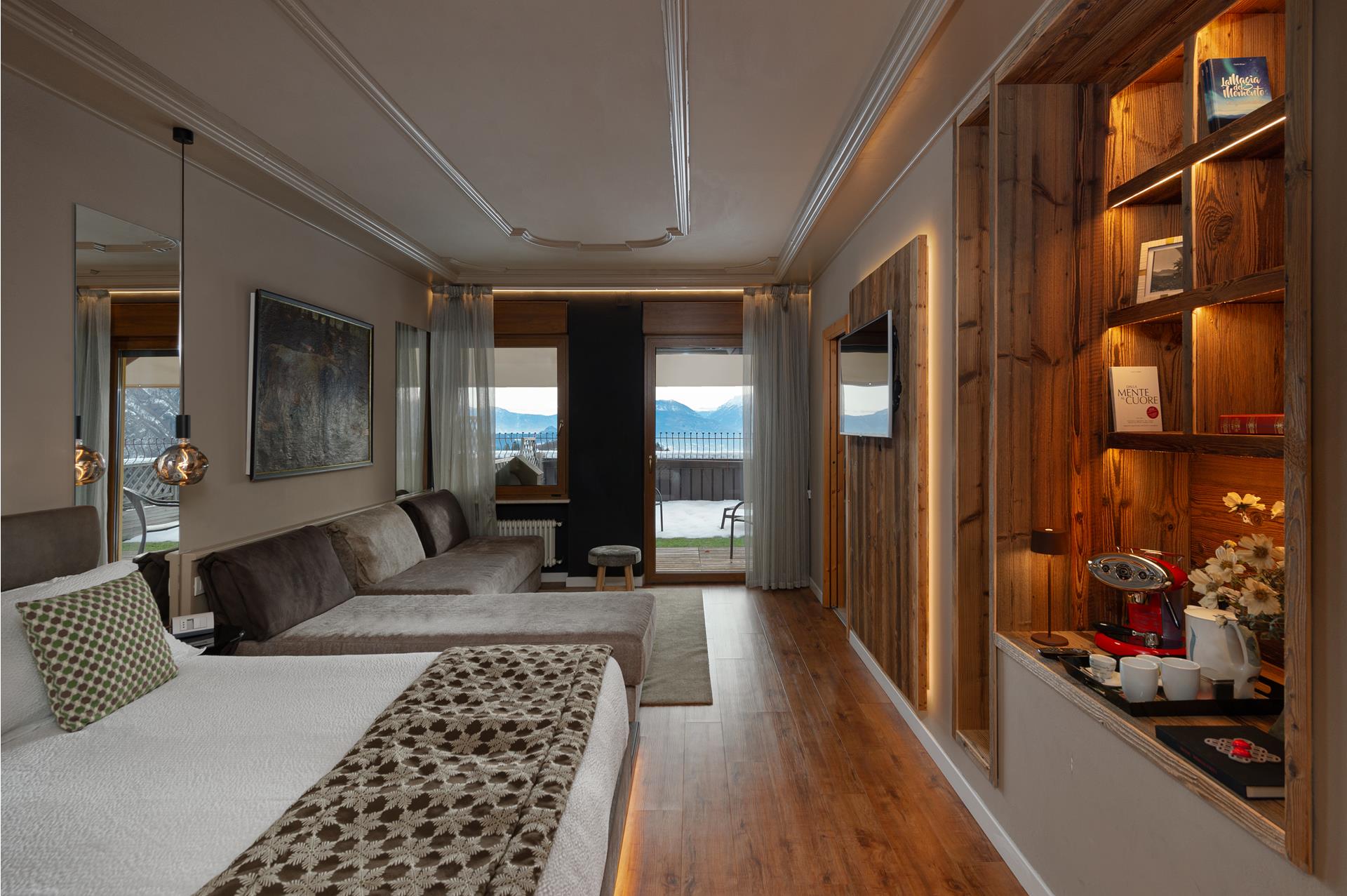 Wie alle unsere Zimmer ist auch dieses mit Polstern und Bettdecken aus antiallergischen Karbonfasern bestückt, welche elektrostatische Strahlung mindern und stressreduzierend wirken soll; damit du erholsamen Schlaf findest und dein körperliches und seelisches Gleichgewicht wieder in Einklang bringst. Perfekt für alle, die gerne viel Platz und es bequem haben wollen. Hier findest du den kleinen entscheidenden Unterschied. Ein großes Open Space Zimmer, das auch Platz für vier Personen bietet ohne an Komfort einzubüßen.