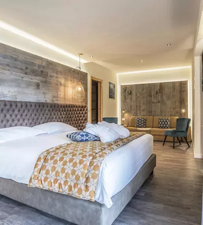 Particularly quiet and panoramic positions. A large room, furnished in natural wood, complete with a balcony equipped with sun-loungers or outdoor armchairs. Large and bright bathrooms, often with separate toilet, walk-in closet, comfortable Simmons World Class mattresses, Flat-TV, tea corner, Illy coffee machine, minibar, telephone, hairdryer, make-up mirror. All our rooms offer hypoallergenic pillows and quilts crafted with carbon fibres, designed to collect electrostatic charges, unload your stress and thus provide you with a perfect night's sleep and a state of regained psychophysical balance.