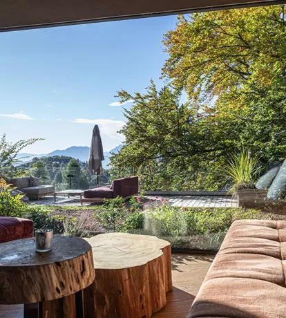 The panoramic terrace overlooking the park, with lounge sofas, glass railings and a corten fireplace, invites guests to relax throughout the seasons. At its centre stands a majestic century-old beech tree, a defining feature of the space.