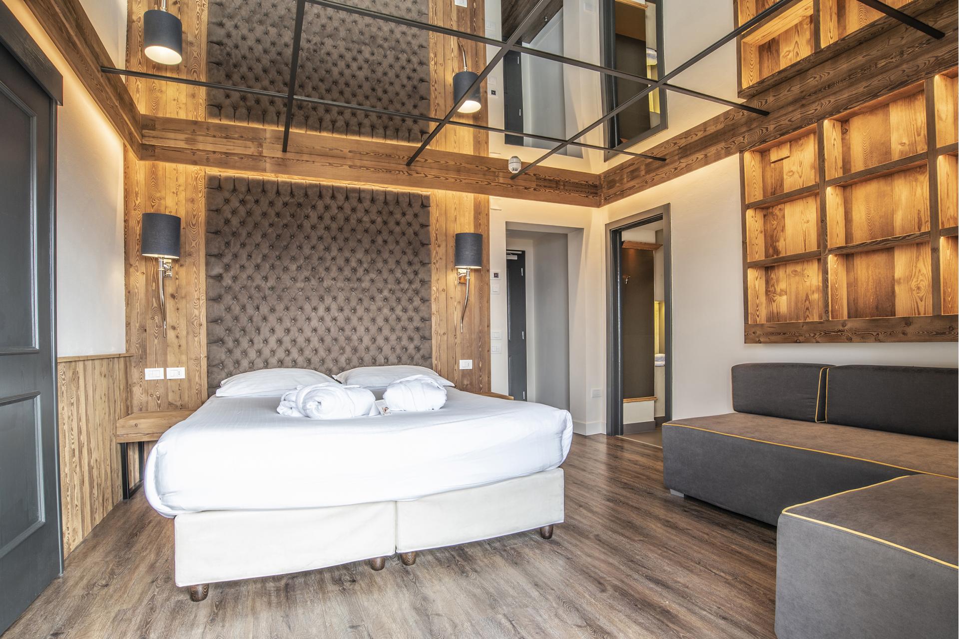 Posizione particolarmente tranquilla e panoramica. Una stanza ampia, arredata in legno naturale e dotata di balcone attrezzato con sdraio o poltroncine da esterno. Ampi e luminosi bagni spesso con wc separati, cabina armadio, comodissimi materassi Simmons World Class, Flat-TV, angolo del tè, macchina del caffè Illy, minibar, telefono, asciugacapelli, specchio per il trucco. Tutte le nostre stanze offrono cuscini e trapunta anallergici con fibra di carbonio capace di raccogliere le cariche elettrostatiche, scaricare tutto lo stress e favorire così un sonno perfetto e uno stato di ritrovato equilibrio psicofisico.